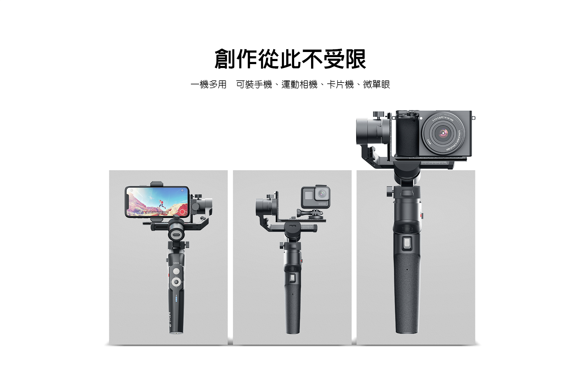 適用於手機、運動相機、微型單眼,且內附手機夾、相機快板,不同的配備都有穩定畫面!