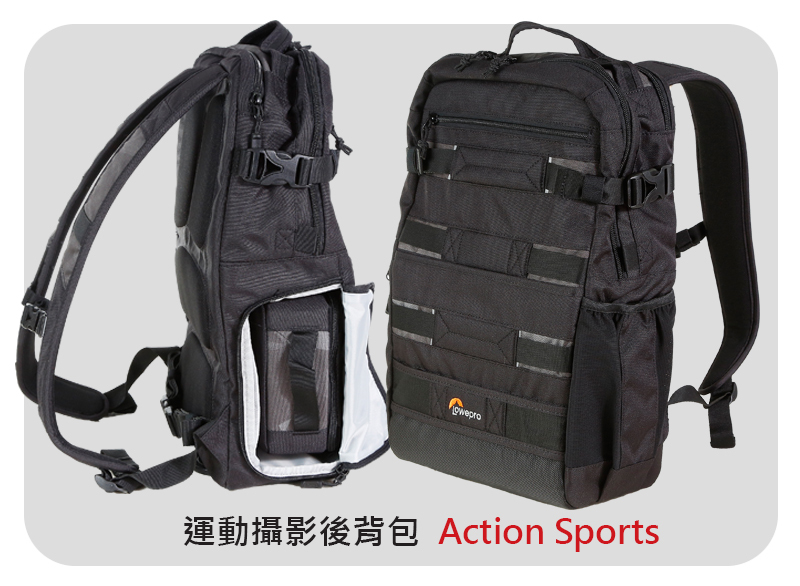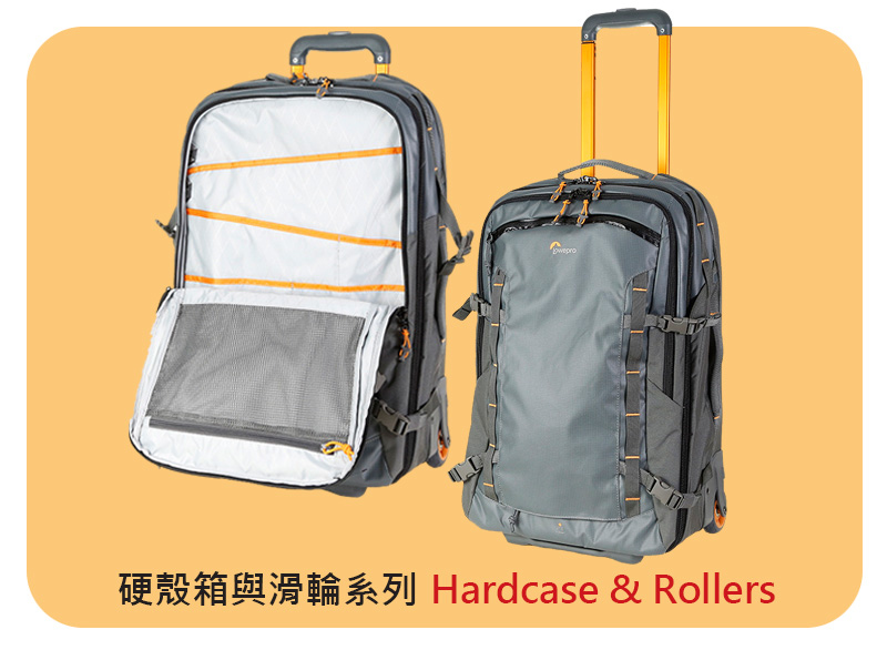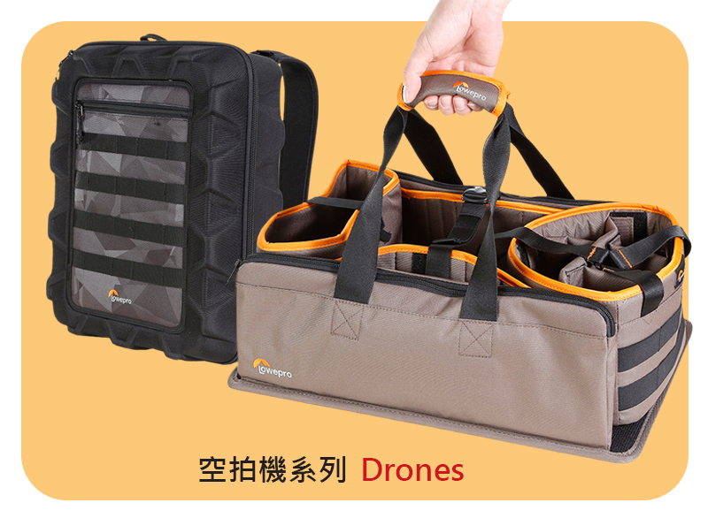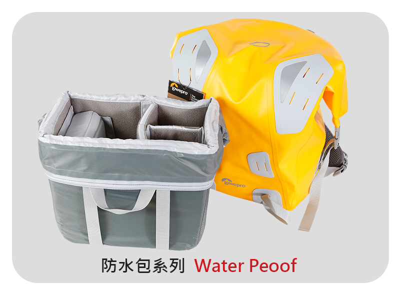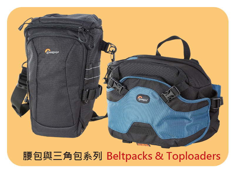 Lowepro背包系列:冒險生活家Ridgeline、運動火箭手Flipside Sport、旅行家後背背包Trekker DayPack II、英武士腰包Inverse、伸縮三角包Toploader Zoom、城市報導家 Urban Reporter、火箭手Flipside、Highline海樂、ProTactic專業領航家、Fastpack BP飛梭、Pro Roller專業滑輪者、ViewPoint觀賞家