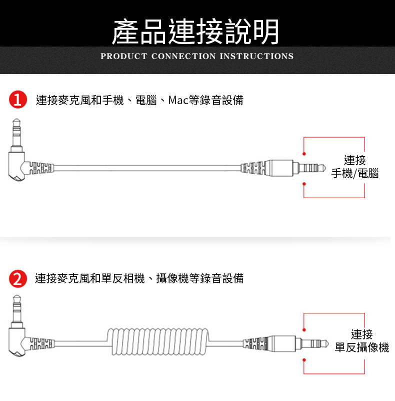 標配:手機連接線1條、相機連接線1條、防震架1個、防風毛1個;