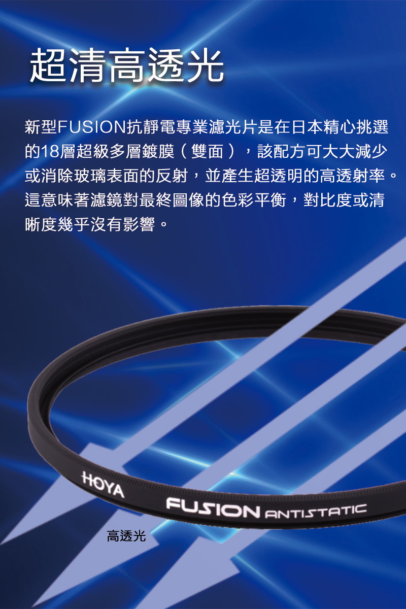 新型FUSION抗靜電專業濾鏡片是在日本使用精心挑选和混合後精心挑選出的精選矽酸鹽製成的,以生產出高性能的光學玻璃。然後,HOYA極其謹慎和精確地應用改進的18層超級多層鍍膜(雙面)配方,該配方可大大減少或消除玻璃表面的反射,並產生超透明的高透射率。這意味著濾鏡對最終圖像的色彩平衡,對比度或清晰度幾乎沒有影響。