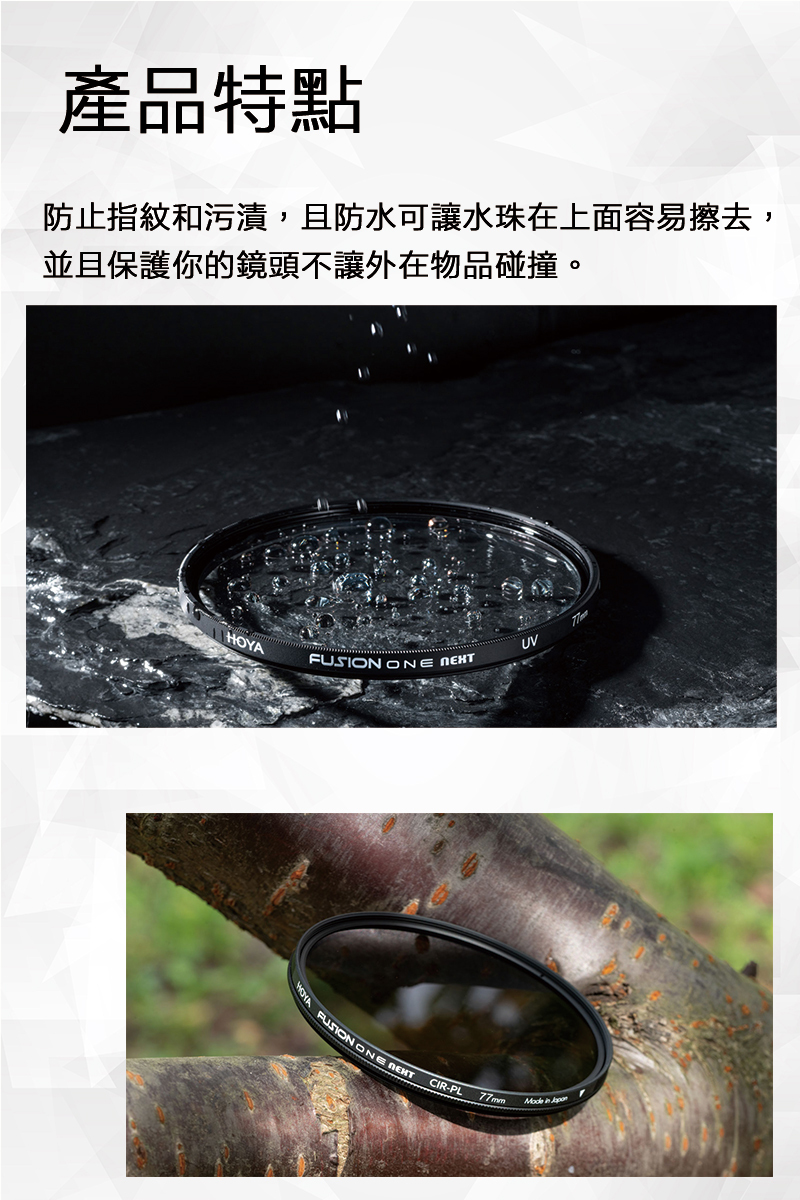 HOYA FUSION ONE加入了HOYA濾鏡產品線,融合了所有極有價值的基本規格,例如多層鍍膜塗層,超高透光率,高級光學玻璃和薄型框架,同時還新增了防污性和防水塗料,以符合照相光學配件行業的新標準。建議業餘和專業攝影師使用。