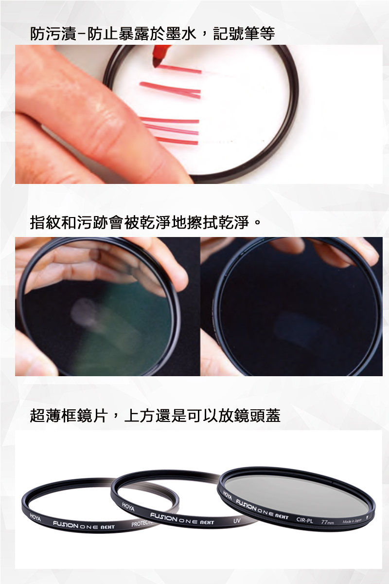 FUSION ONE NEXT保護器的玻璃由HOYA的專業級光學玻璃製成,具有最高的影象品質。 它的外圈是黑色邊緣的,最大限度地減少了框架內的反射。