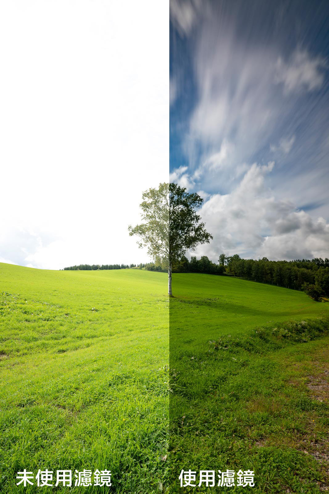 下面為範例,平常曝光對準地上,往往天空就過曝了(左邊),使用濾鏡後,可以讓亮處以及暗處得以平衡