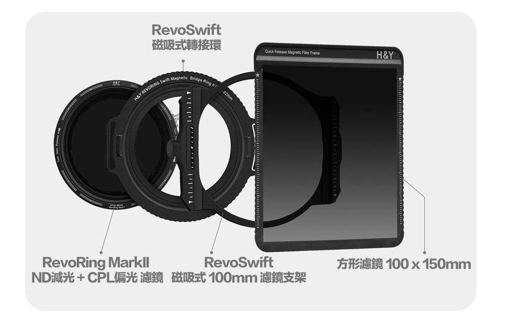 RevoRing MKII的另一個重大升級,是與H&Y全新RevoSwift系列的完美整合,包括RevoSwift磁吸遮光鬥和100x100mm / 100x150mm磁吸過濾系統。突破RevoSwift獨特橋接環,即可輕鬆安裝大型方形濾鏡,讓您在控光與影像風格上擁有更大柔性。