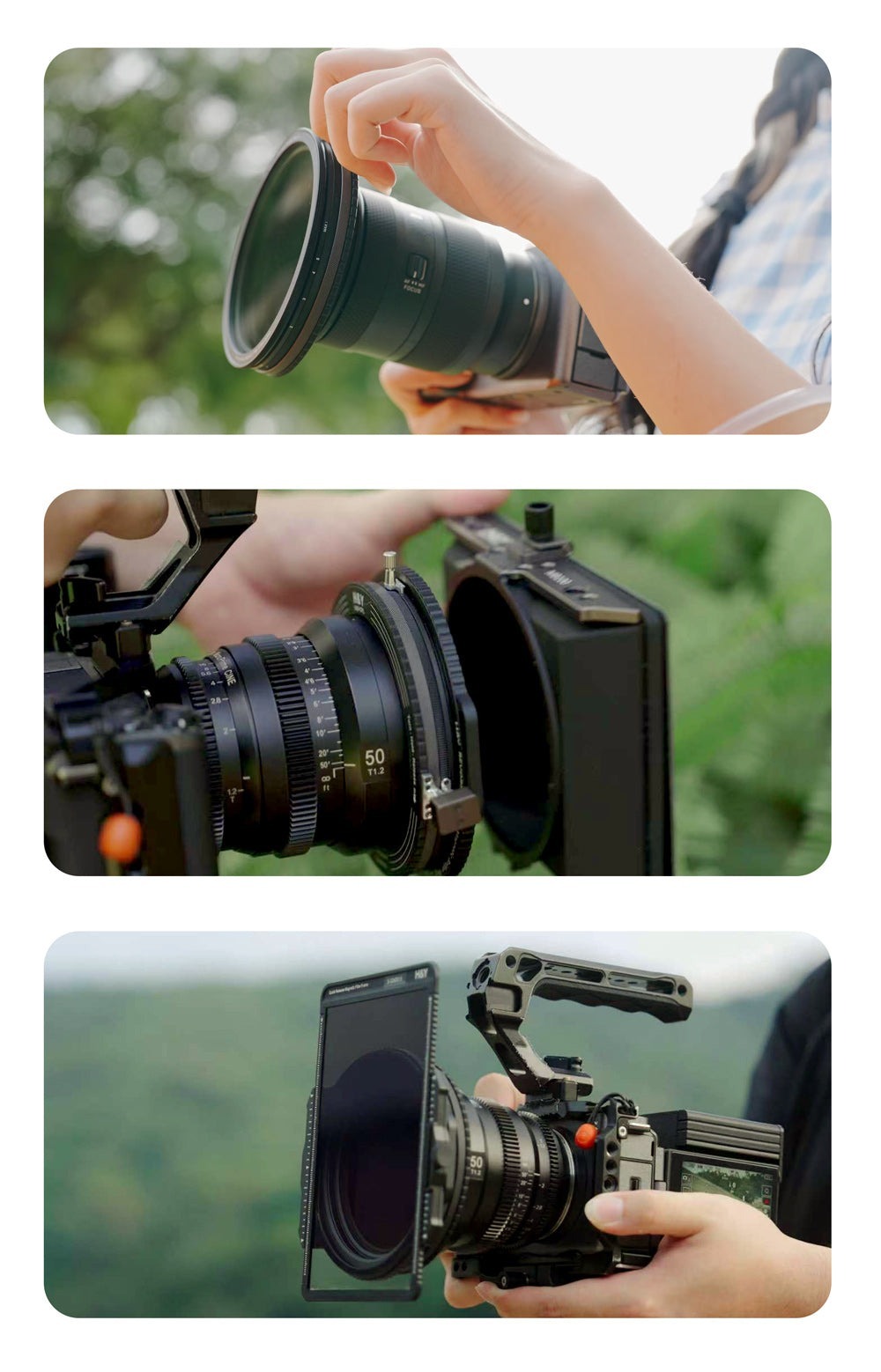 RevoRing MKII 支援多片式濾鏡使用,可將可調 ND + 偏光鏡(VND+CPL)搭配 100mm / 150mm 方形磁吸濾鏡同時使用,且不影響設定與亮度控制。搭配 RevoSwift 遮光鬥使用,更加成為一套功能完整、靈活的創作平台,實現更精細的光影與影像品質提升。