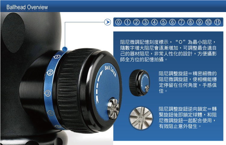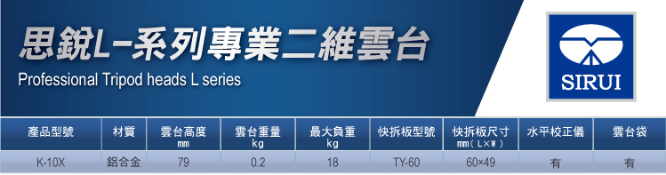 | 型 號:K-10X 直 徑:33mm 高 度:96mm 自身重量:0.39Kg 最大負重:20Kg 適配三腳架:0/1 系列三腳架 |