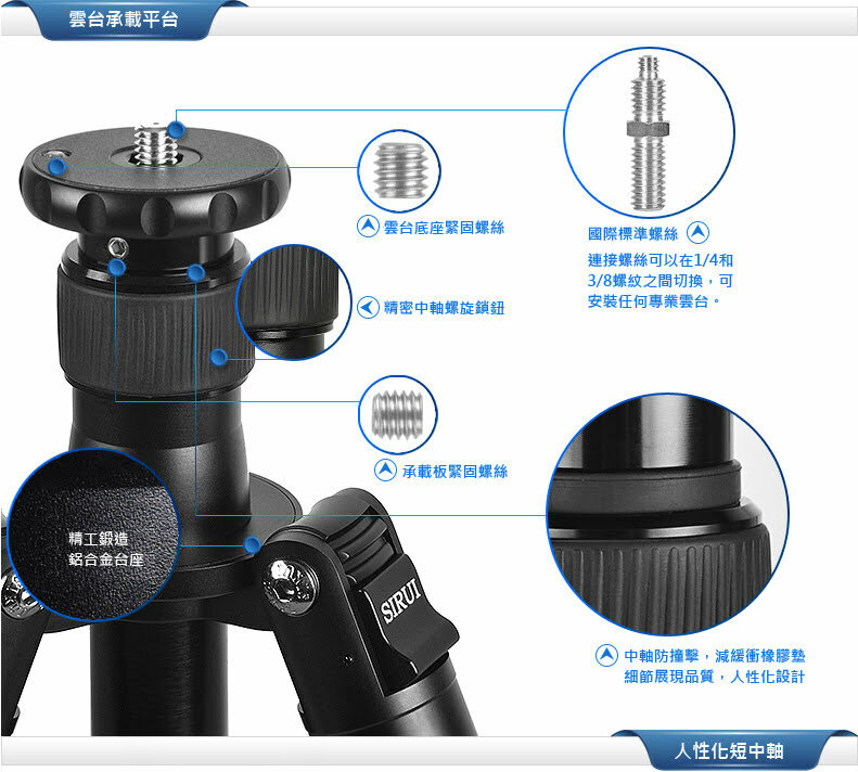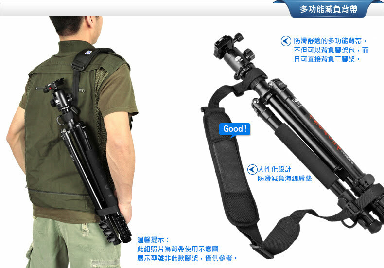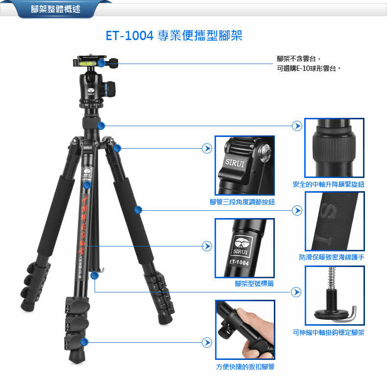 思銳ET-1004三腳架 1. 扳扣式腳管鎖緊設計,開合迅速;2. 折合後緊湊小巧,可放入背包和隨身行李中; 3. 腳管可180°反折,非常緊湊; 4. 中軸可倒置,適合低角度拍攝; 5. 三支腳都配有自動角度調節按鈕,操作快捷、方便; 6. 配送短中軸,可進行低角度和微距拍攝; 7. 腳管有三個調節檔位,適合於不平坦地形。 思銳E-10球形雲台 1. 設有獨立的底座調節鎖緊旋鈕和主旋鈕,鎖緊力控制和靈活性獨具優勢。 2. 帶有水平儀,便於快速做水平調節。 3. 思銳獨特的鎖緊功能設計,鎖緊力達8kg(17.6lb),保證了其鎖緊力優勢。 4. 鎖緊旋鈕表面由極耐磨損的金屬鍍成,旋鈕堅固。 5. 製作精密,阻尼平滑,操作無跳動感。 標準配置: 三腳架,雲台,快裝板,短中軸,定制腳架包,肩帶,小工具,說明書,保修卡