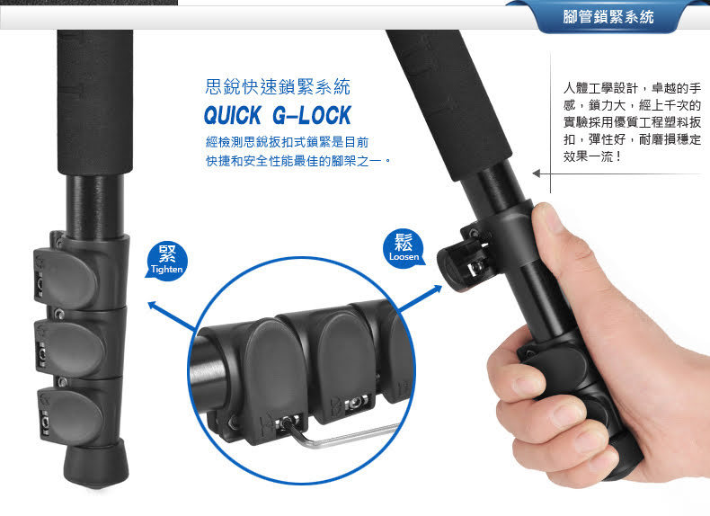 1. 扳扣式腳管鎖緊設計,開合迅速;