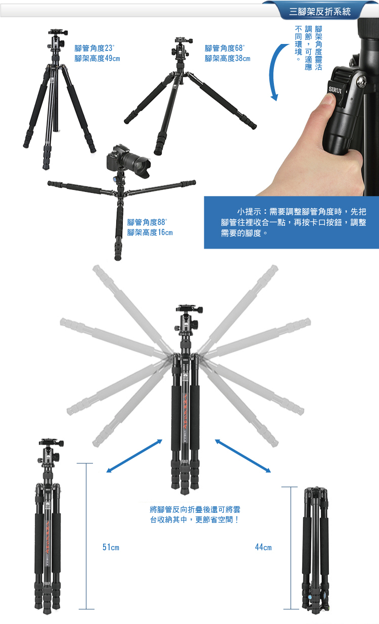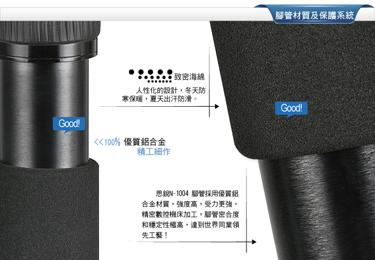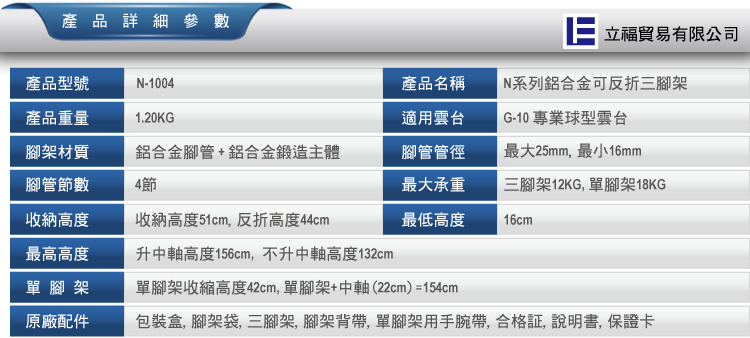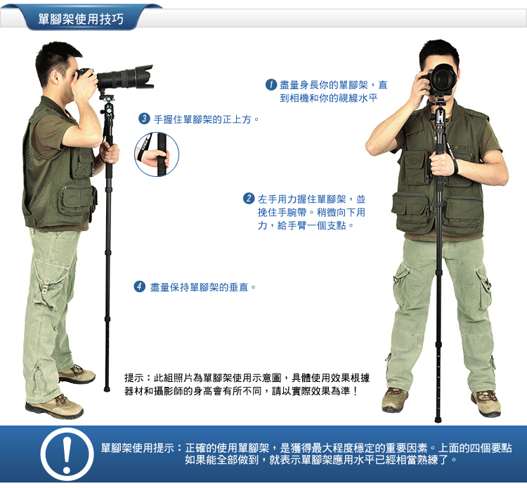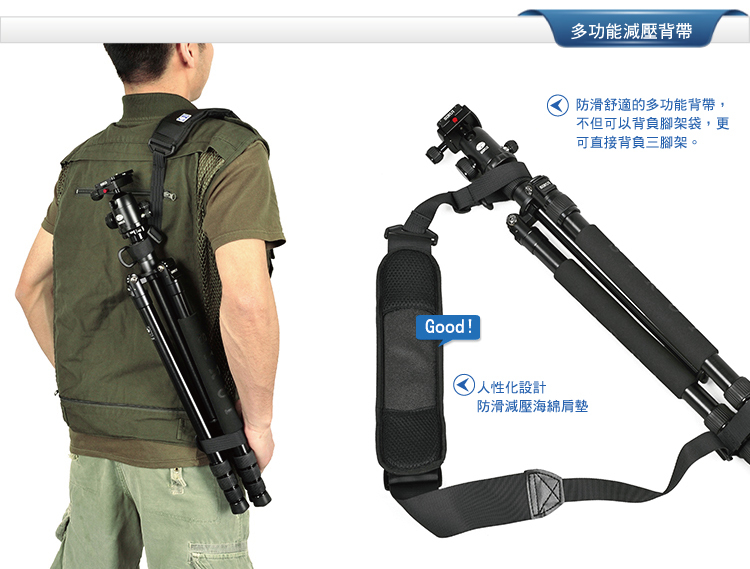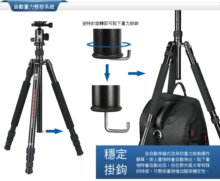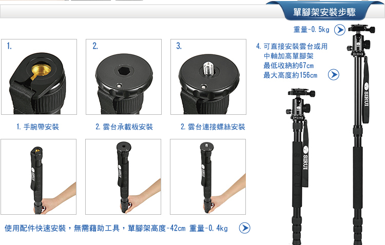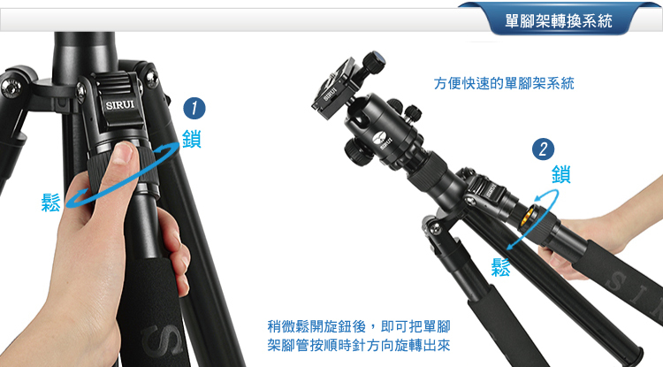 1. 可轉換為獨腳架,長中軸連接可拆卸腳,增加獨腳架的高度;