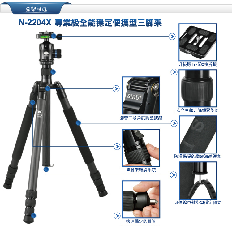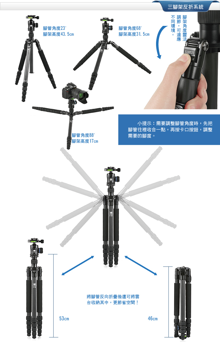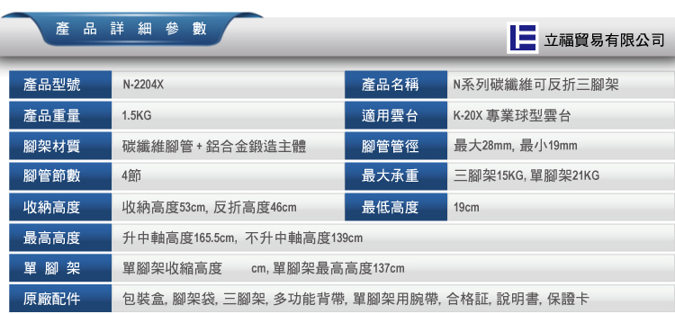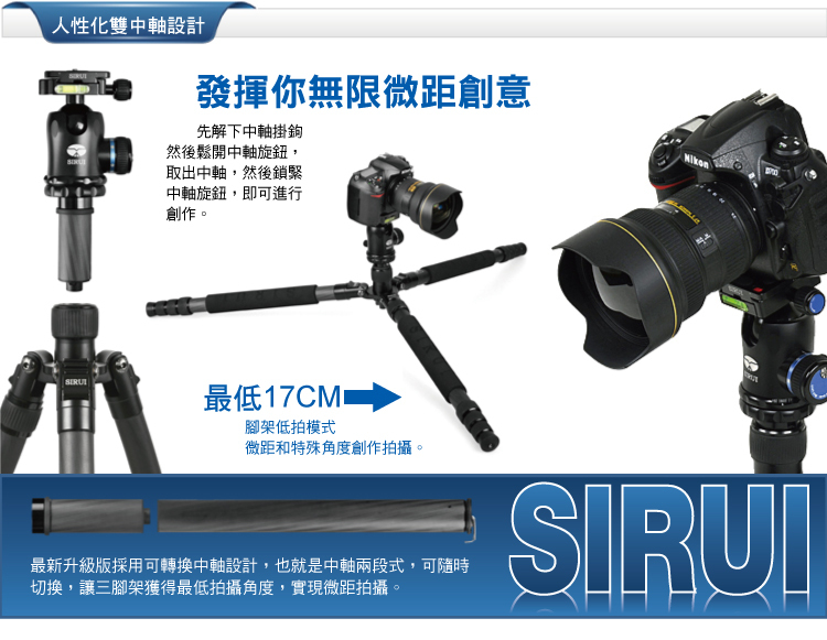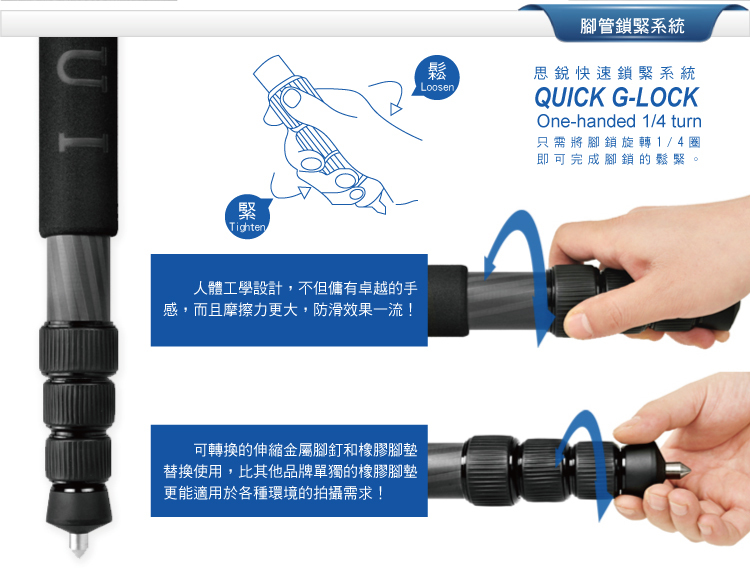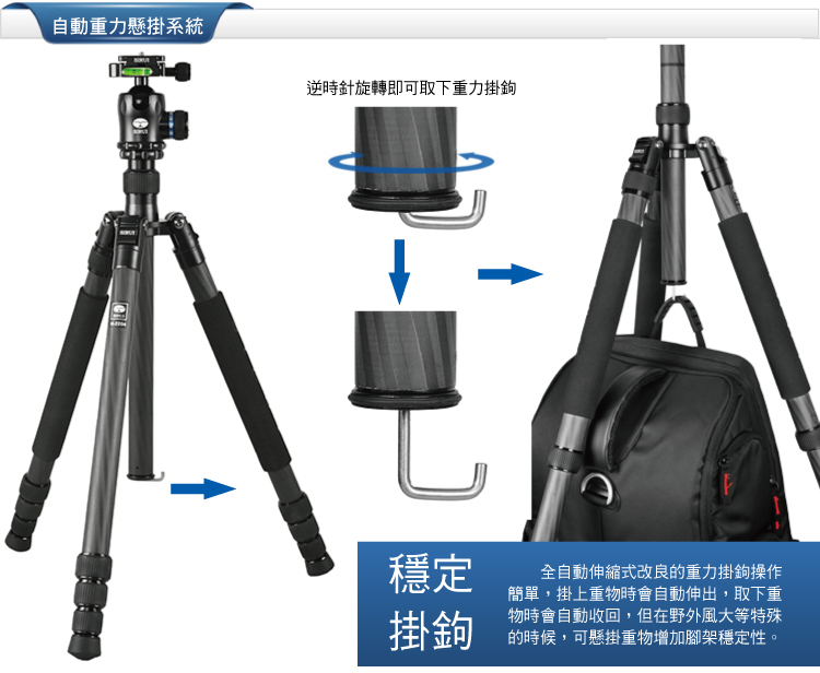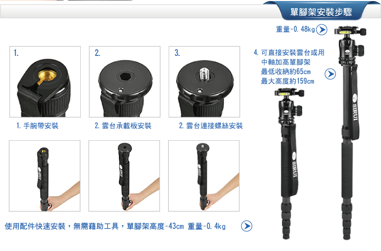 1. 可轉換為獨腳架,長中軸連接可拆卸腳,增加獨腳架的高度;
