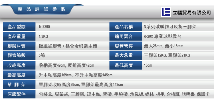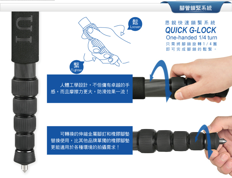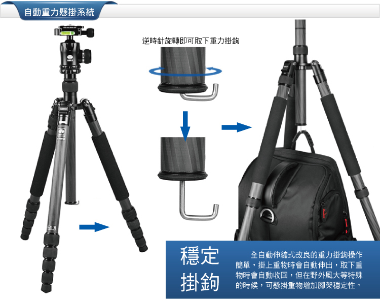 1. 可轉換為獨腳架,長中軸連接可拆卸腳,增加獨腳架的高度; 2. 腳管反折180°,結構緊湊; 3. 腳管採用8層100%純碳纖維,重量輕、硬度強,承重力明顯提升,還具減震功能; 4. 中軸可以倒置,進行超低角度拍攝; 5. 每支腳管具有一個自動角度調節按鈕,操作方便快捷; 6. 拆卸掉長中軸可進行低角度拍攝或微距拍攝; 7. 有3個角度調節檔位,適合於不平整地形; 8. 帶伸縮腳釘設計,野外拍攝更方便; 9. 可將雲台+腳架套件直接裝入包內; 10. 腳架底部的彈簧掛鉤可以懸掛重物,增加穩定性。