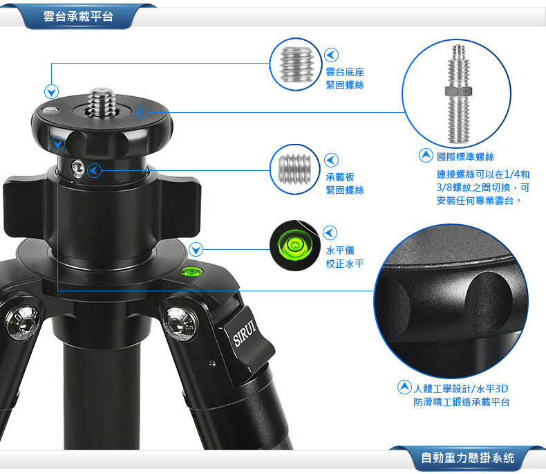 1. 設有獨立的底座調節鎖緊旋鈕和主旋鈕,鎖緊力控制和靈活性獨具優勢 ; 2. 帶有水平珠,便於快速做水平調節; 3. 思銳獨特的鎖緊功能設計,鎖緊力達12kg(26.5lb),保證了其鎖緊力優勢; 4. 鎖緊旋鈕表面由極耐磨損的金屬鍍成,旋鈕堅固; 5. 製作精密,阻尼平滑,操作無跳動感。
