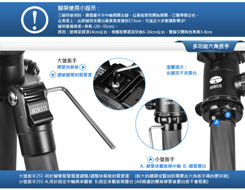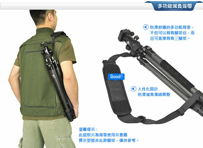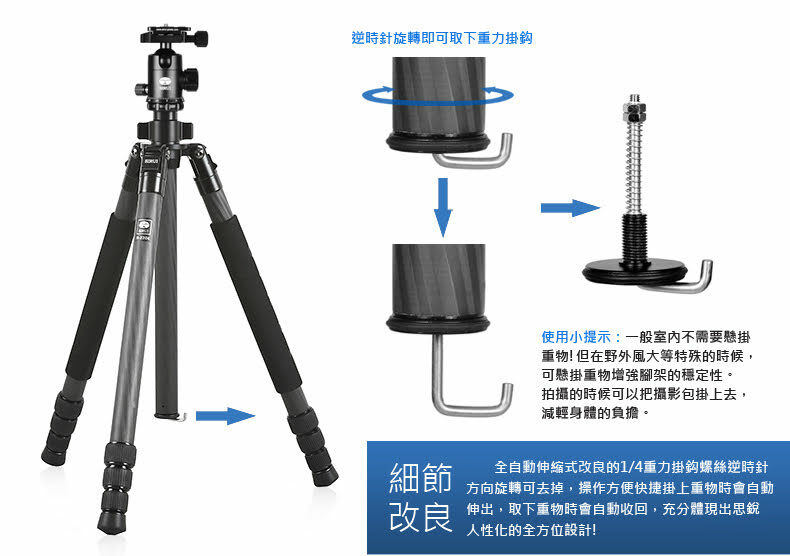 1. 配有水平珠,水平調節十分簡單; 2. 每支腳都有角度調節按鈕,操作方便快捷; 3. 腳管採用8層100%純碳纖維製成,強度更大,承重出色,減緩振動! 4. 中軸可以倒置,進行超低角度拍攝; 5. 2個角度調節檔位,適合不平整地形拍攝; 6.帶伸縮腳釘設計,野外拍攝更方便; 標準配置: 三腳架, 腳架包, 背帶, 工具, 說明書, 保修卡 雲台產品概述: