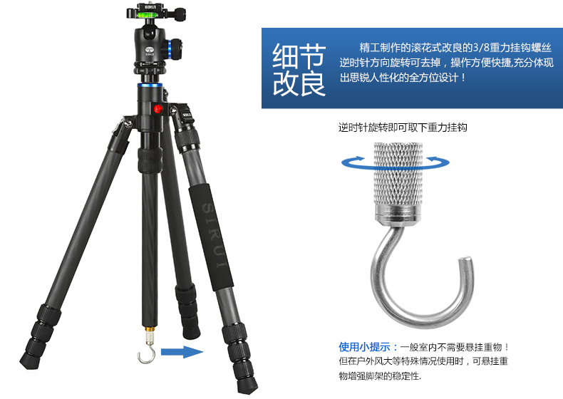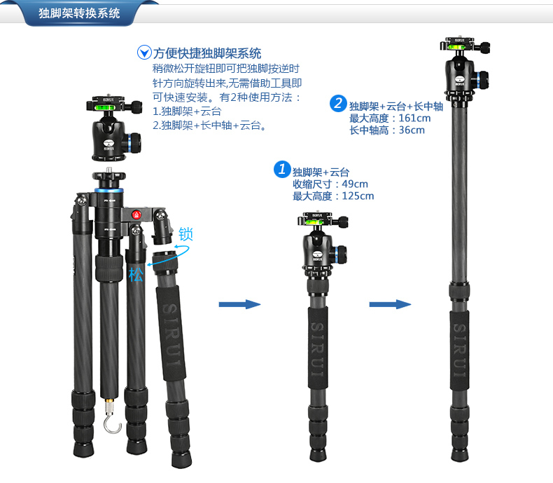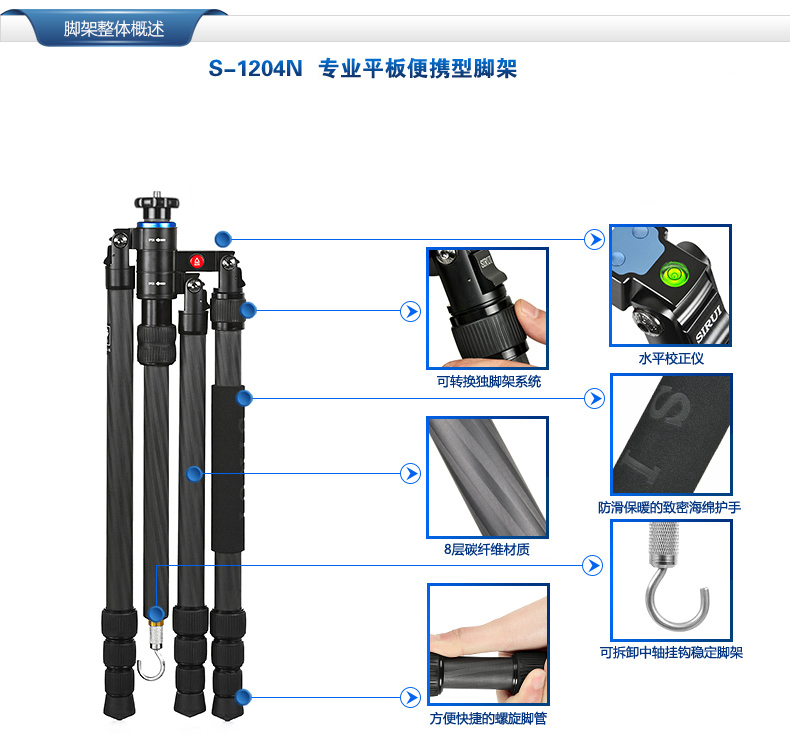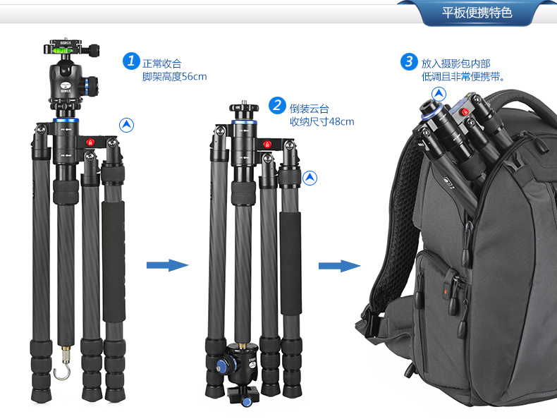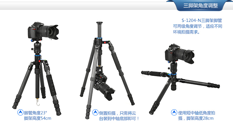 1. 平板結構,方便攜帶和儲存。 2. 可轉換為獨腳架使用,中軸可以增加獨腳架的高度。 3. 腳管採用8層100%純碳纖維製成,強度更大,承重出色,減緩振動! 4. 中軸可以倒置,適用於低角度拍攝和特寫拍攝。 5. 每支腳都有角度調節按鈕,操作快捷、便利 6. 配有短中軸,適合於低角度拍攝和微拍。 7. 有兩檔角度調節,適合於不平整的地形。 8. 中軸底部的掛鉤可以放置其他的重物(沙袋、相機袋等)來增加腳架的穩定性。 標準配置: 三腳架、腳架包、背帶、短中軸、工具、說明書、保修卡