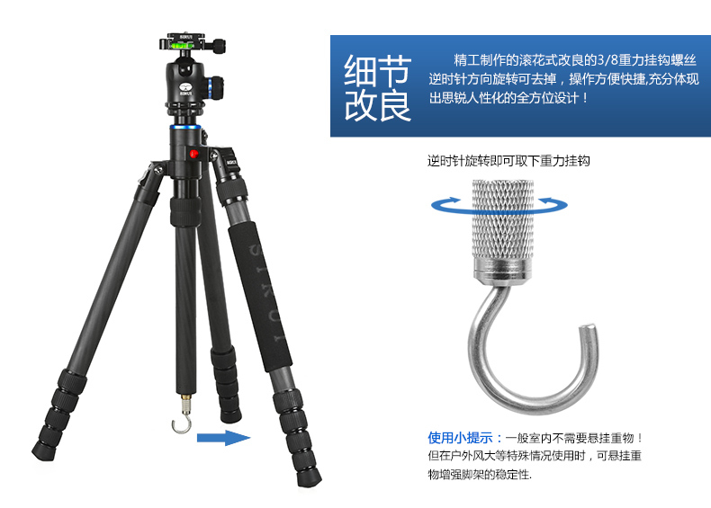 9. 中軸底部的掛鉤可以放置其他的重物(沙袋、相機袋等)來增加腳架的穩定性。