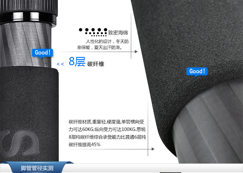 3. 腳管採用8層100%純碳纖維製成,強度更大,承重出色,減緩振動!