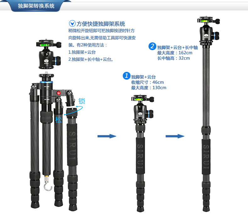2. 可轉換為獨腳架使用,中軸可以增加獨腳架的高度。