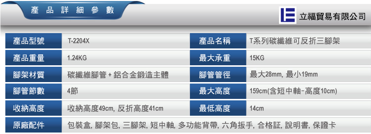 | T-2204X | 碳纖維 | 4 | 28/1.1 | 19/0.7 | 140/5.5 | 1220/48 | 1435/56.5 | 485/19.1 | 420/16.5 | 1.3/2.9 | 15/33.1 |