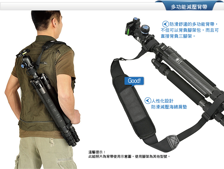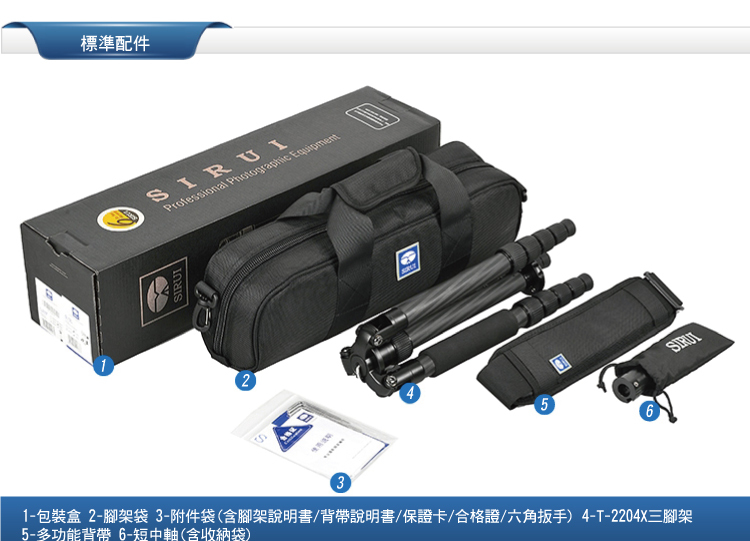 標準配置:三腳架,短中軸,腳架包,肩帶,工具,說明書,保修卡
