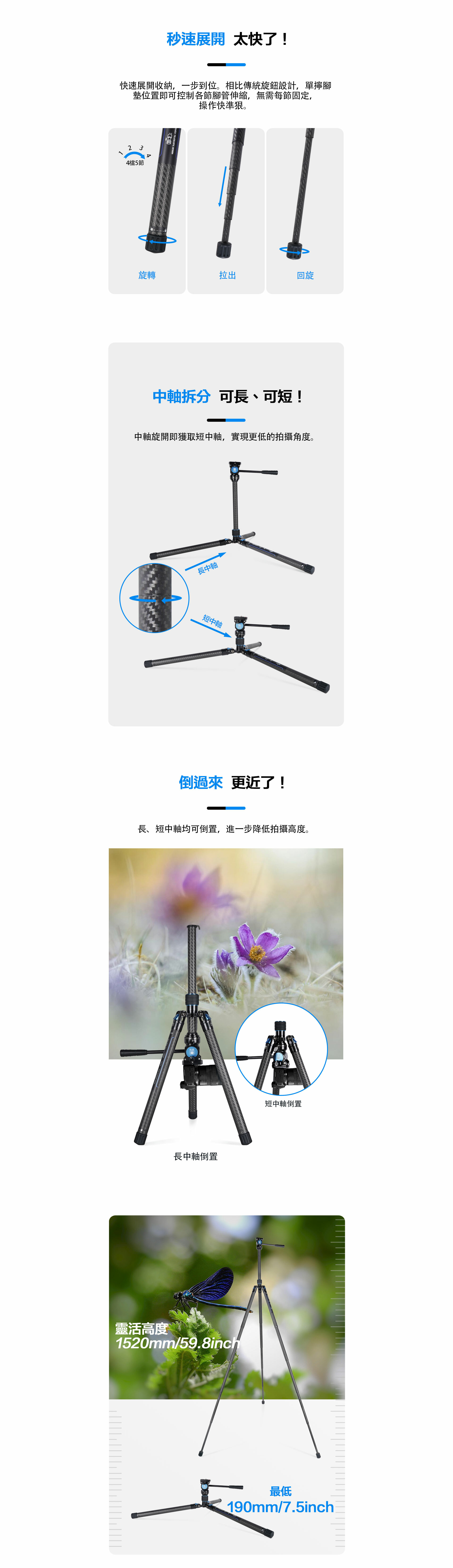 ■ 中軸可拆分,可長可短,實現更低的拍攝角度