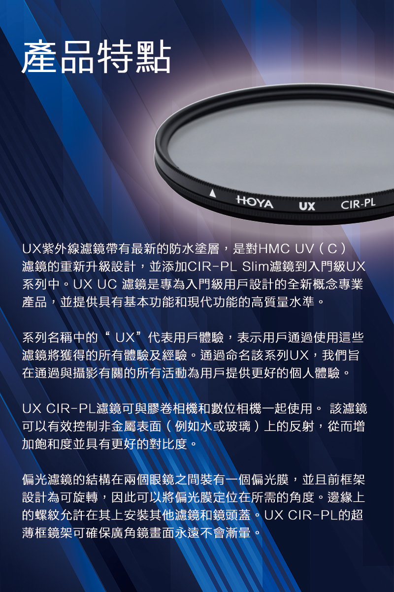 UX紫外線濾鏡帶有最新的防水塗層,是對HMC UV(C)濾鏡的重新升級設計,並添加CIR-PL Slim濾鏡到入門級UX系列中。UX UC 濾鏡是專為入門級用戶設計的全新概念專業產品,並提供具有基本功能和現代功能的高質量水準。系列名稱中的“ UX”代表“用戶體驗”,表示用戶通過使用這些濾鏡將獲得的所有體驗及經驗。通過命名該系列UX,我們旨在通過與攝影有關的所有活動為用戶提供更好的個人體驗。UX CIR-PL濾鏡可與膠卷相機和數位相機一起使用。 該濾鏡可以有效控制非金屬表面(例如水或玻璃)上的反射,從而增加飽和度並具有更好的對比度。偏光濾鏡的結構在兩個眼鏡之間裝有一個偏光膜,並且前框架設計為可旋轉,因此可以將偏光膜定位在所需的角度。邊緣上的螺紋允許在其上安裝其他濾鏡和鏡頭蓋。UX CIR-PL的超薄框鏡架可確保廣角鏡畫面永遠不會漸暈。