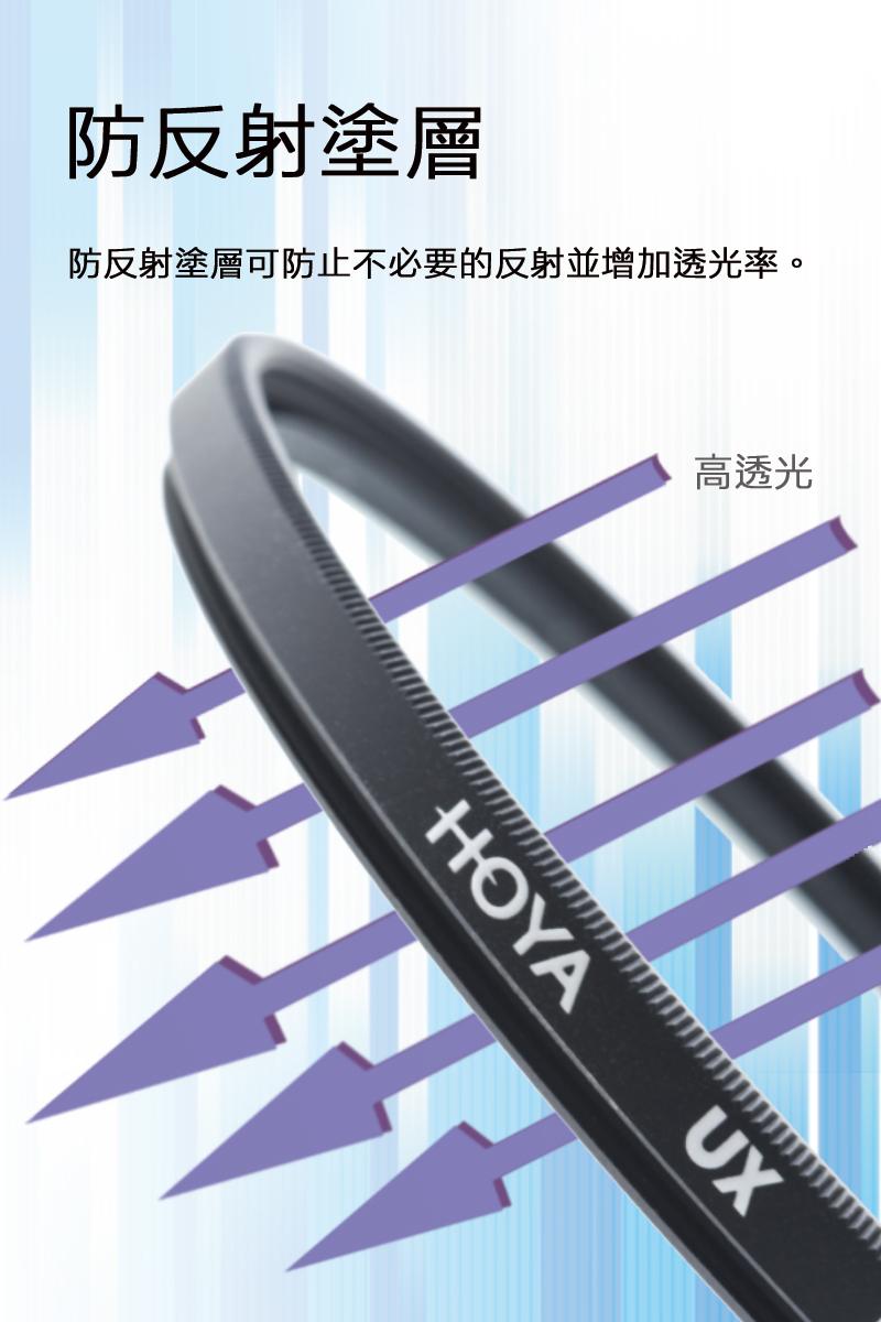 UX WR防水塗層已被添加到抗反射塗層中。這種塗層可以防止水滴進入,並更容易清潔濾鏡表面上的污垢或指印。