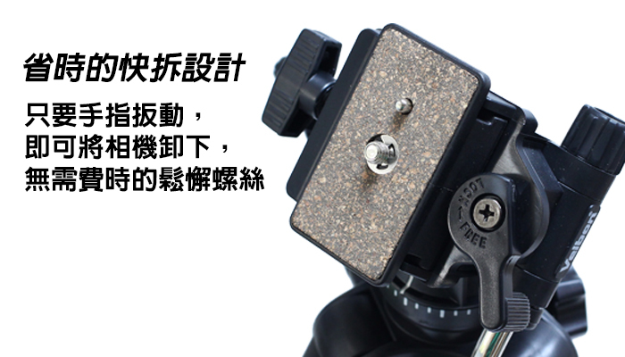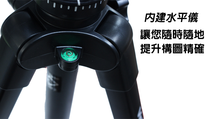 雲台上可上下、左右微調的刻度裝置,讓您可精準的調整合適拍攝的最佳位置,此款腳架能使用三種段數調整拍攝高度,在不同的地形上讓您的攝影機更加平穩,材質精良,耐用度極高,結構簡單不易損壞,採用齒輪式中間軸昇高設計以及扳扣式固定設計,讓使用者可以輕鬆地調整腳架高度,